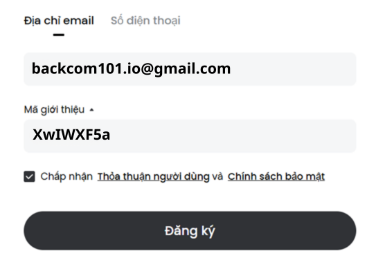 Bước 3: Dùng địa chỉ email để đăng ký tài khoản và tạo mật khẩu cho tài khoản. Ở bước 1, nếu các bạn đăng ký tài khoản qua link thì các bạn sẽ thấy mã giới thiệu của Backcom101.io sẽ được tự động điền sẵn vào form. Nếu trực tiếp vào Gate.io thì các bạn phải nhập mã này vào ô Mã giới thiệu: XwIWXF5a