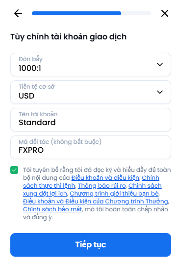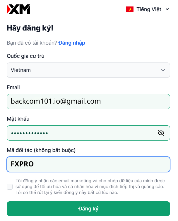 Điền email, tạo mật khẩu tài khoản và nhập mã IB: FXPRO vào ô Mã đối tác. Sau đó bấm Đăng ký.